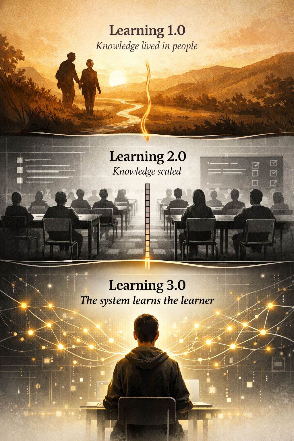 Learning 1.0 was biologically constrained — knowledge lived in bodies and voices, passed forward through presence and story. Learning 2.0 externalized knowledge into books, institutions, and scientific method — software upgradable, but the classroom's "hardware" remained static. Learning 3.0 introduces a system that can study the learner, adapt to their cognitive architecture in real time, and co-design the educational experience itself.